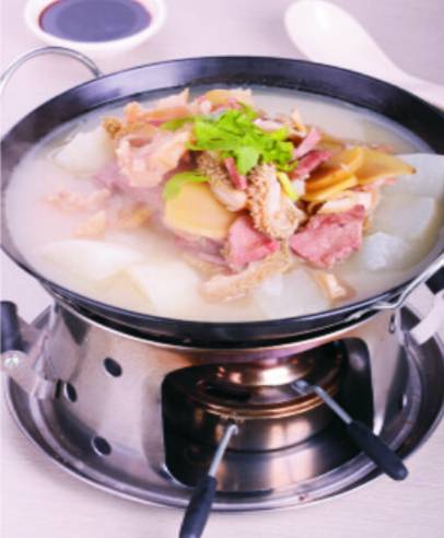 原料:胜屏风牌保鲜天麻200克、土豆片、玉兰片各150克,牛肚250克,牛肉500克,白荷花、黄豆芽(开始扭嘴时)、油菜、猪板油各100克,生姜片25克,葱白段15克,胡椒粉5克,味精8克,精盐10克,牛骨头汤。