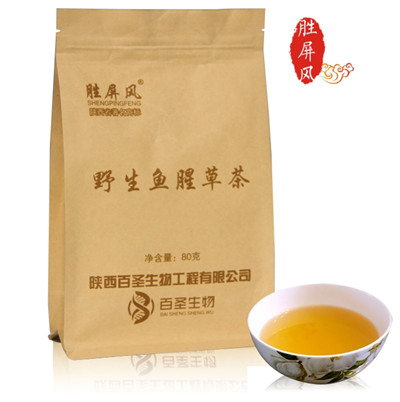 陕西百圣生物工程有限公司研发生产的野生鱼腥草茶,选自秦岭南麓海拔约400米~1500米略阳县金家河流域山坡地带,以采摘叶多、色绿、有花穗、鱼腥气味浓的纯天然原生态野生鱼腥草全草为原料。经现代科学工艺,保留其有效成份,经开水冲泡后,不仅没有浓烈的鱼腥味,而且茶汤色似红茶,并散发出类似肉桂的香味。